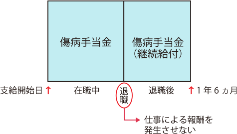 もう1つは「傷病手当金」です。病気やけがによる労務不能日の4日目から、標準報酬日額※の3分の2を受け取れるというもので、支給される期間は同一傷病につき1年6ヵ月です。健康保険に1年以上加入していた人が退職時に傷病手当金を受給していた場合、在職中に受け取っていた期間を除き、退職後も引き続き受け取ることができます。ただし、「退職日当日に働けない状態であること」が前提になるので、無理して当日に仕事をしないよう気をつけましょう。