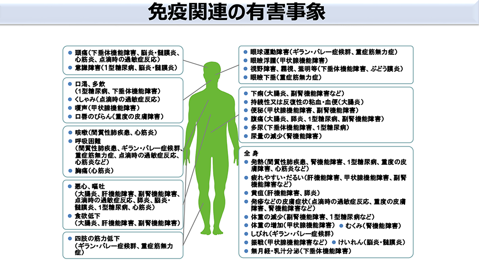 免疫チェックポイント阻害薬の特徴として、投与開始後しばらくは一般的な抗がん剤治療と効果にそれほど違いはありませんが、最終的にはより高い効果が長く続いていくことが確認されています5)。免疫チェックポイント阻害薬は私たちの身体に備わっている免疫を活用する仕組みであるため、その免疫が一度がんを認識するとそれをずっと覚えていて、がんを抑制する仕組みが長く維持されていくのではないかと考えられます。しかし、免疫チェックポイント阻害薬にも有害事象が報告されています(図1)6)。免疫チェックポイント阻害薬によって元々備わっているTリンパ球が元気になり過ぎることで、Tリンパ球の過剰な働きが正常な臓器も傷つけ、自己免疫疾患に類似した問題が起きる可能性があるのです。こういった症状は個人差が大きく、いつ、どのような症状が起こるか予測が難しいとされていますが、治療中断とならないためにも有害事象を常に念頭に置く必要はあります。