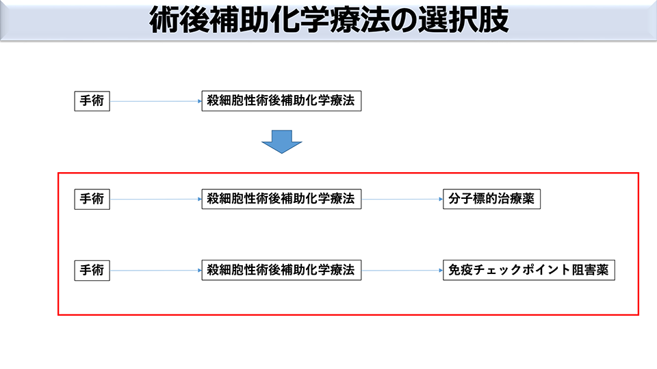 これまでは、術後補助療法として抗がん剤治療がおこなわれてきました。近年では、手術後にまず抗がん剤治療をおこない、そのあとに分子標的治療をおこなうこともあります。これは、手術後に遺伝子異常が特定できた患者さんの選択肢です。さらに手術後の抗がん剤治療のあとに、PD-L1の発現状況に応じて免疫チェックポイント阻害薬による治療をおこなうことも選択肢に加えられました。(図2)4)。