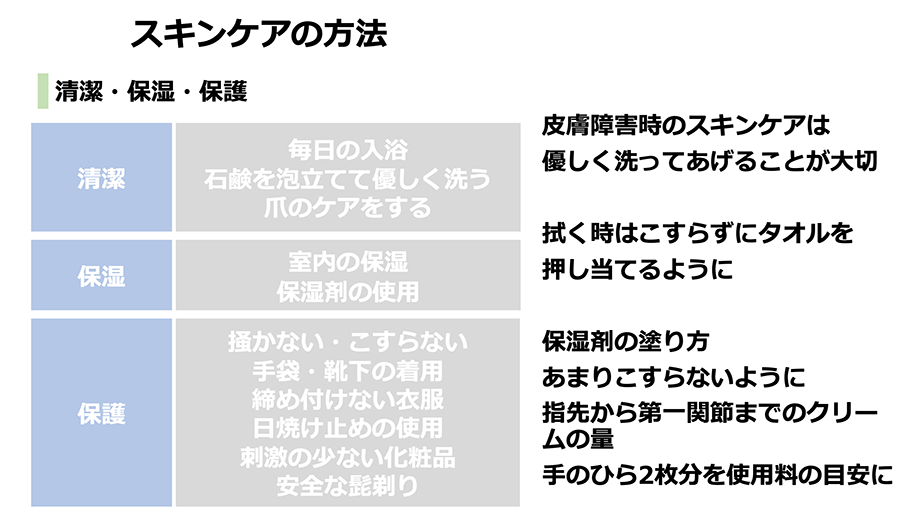 皮膚障害の対処法のポイントは皮膚の清潔、保湿、物理的刺激の回避