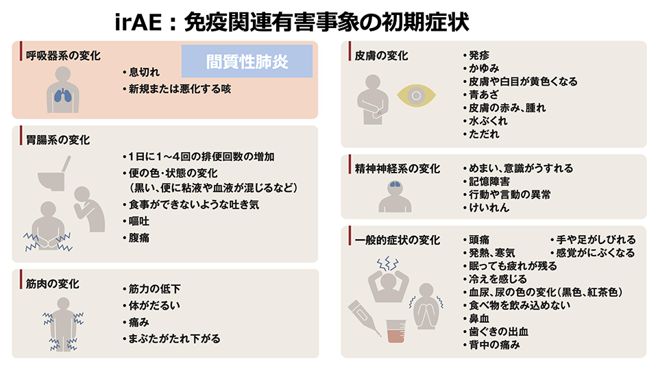 免疫チェックポイント阻害薬の副作用もさまざまですが、多くは免疫関連有害事象です。免疫関連有害事象は、自己免疫疾患と呼ばれる病気とよく似ています。自己免疫疾患は自分自身の免疫が過剰に働いて正常な臓器を攻撃して起こる病気で、関節リウマチなどがよく知られています。免疫チェックポイント阻害薬も必要以上に自分の免疫を活性化させることがあるため、全身の至るところでさまざまな症状を起こす可能性があります。たとえば、呼吸器系の免疫関連有害事象である間質性肺炎は、命にかかわることもあるので注意が必要です。間質性肺炎の初期症状は息切れ、徐々にひどくなる咳、風邪様症状です。