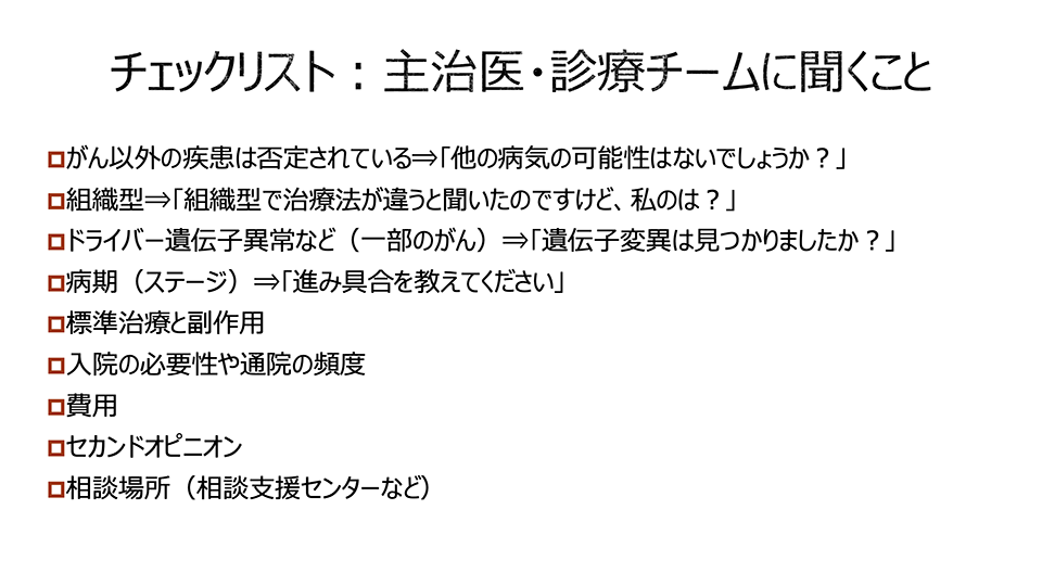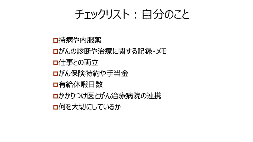 がんになったら主治医や診療チームに聞くこと、自分で確認して伝えるべきことをチェックリストにまとめました。ぜひご活用ください。医師の立場としては、患者さんが何を大切にしているかを教えていただけると、とても助かります。