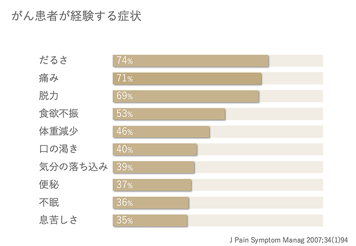 がんは痛い病気とよくいわれますが、だるさを経験する方も多いです。がんの患者さんがよく経験する症状を下図に示します。がんの症状としてのだるさに加えて、治療の副作用によるだるさもあるため、だるさで困っている方は多いと推測されます。