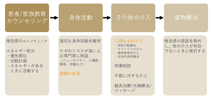 倦怠感に対しては、まず患者さんとご家族に教育やカウンセリングをおこないます。そして身体活動、心理社会的介入等のその他の介入をおこなった上で、薬物療法について検討するという流れです。