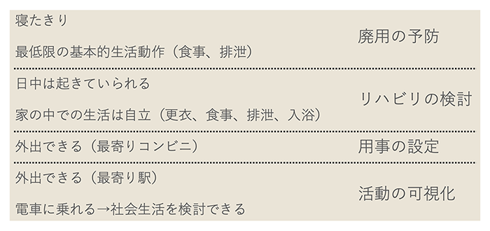 たとえば、寝たきりに近い方であれば、トイレに行くためにはどうしたらよいかと話し合い、日中起きていられるが外出は難しい方には、少し外の空気を吸うようにアドバイスしています。まずはできることをやり、それができればその状態を維持する、あるいは一つ上の段階のことができるか、緩和ケアの外来で話し合っています。