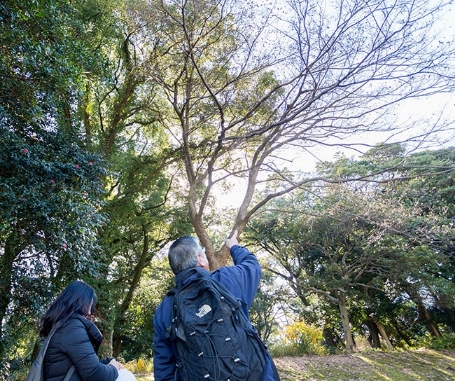 他にも、公園の所々にはヤシの仲間であるシュロが生えています。江戸時代に植えられたとは考えづらいですが…? 先生の分析によると、「鳥が実を食べ、ここで糞をすることで運ばれてきたのでしょう。ここではシュロ以外にも、トウネズミモチなど近代以降に人や生き物などによって持ち込まれた“インベーダー”がいくつか見られます。どんな木も理由や歴史があってそこにあるわけです。突然ライバルがいなくなったからなのか、動物や鳥に運ばれたのか、誰かが植えたのか。どんな理由であっても、そこで根を張り、頑張って生きている。どんな木にも物語があるのです。ぜひ、図鑑などを通じて、1本の木との対話を楽しんでみてください」