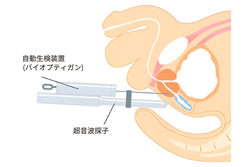 直腸に超音波探子を挿入し、前立腺の画像を映しながら、がんの場所やがんの好発部位などをねらって、自動生検装置(バイオプティガン)にて針を刺入し、6箇所以上の組織を採取します。